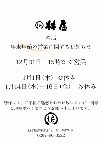 【うなぎ林屋】【年末年始営業のお知らせ】