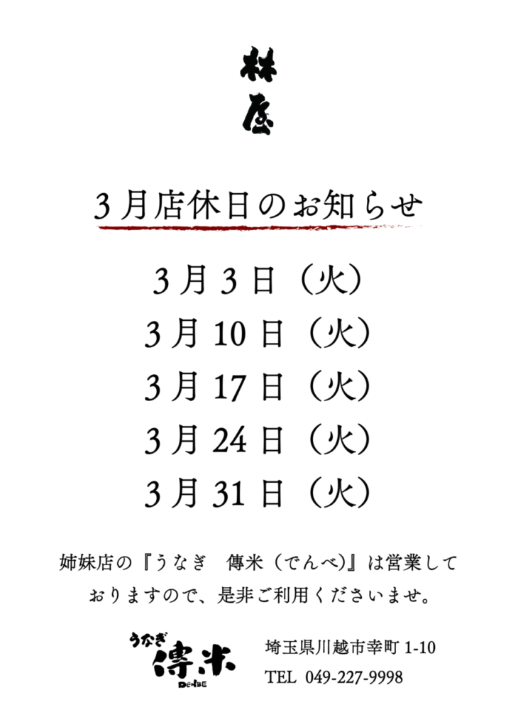 【うなぎ林屋】【3月営業のお知らせ】